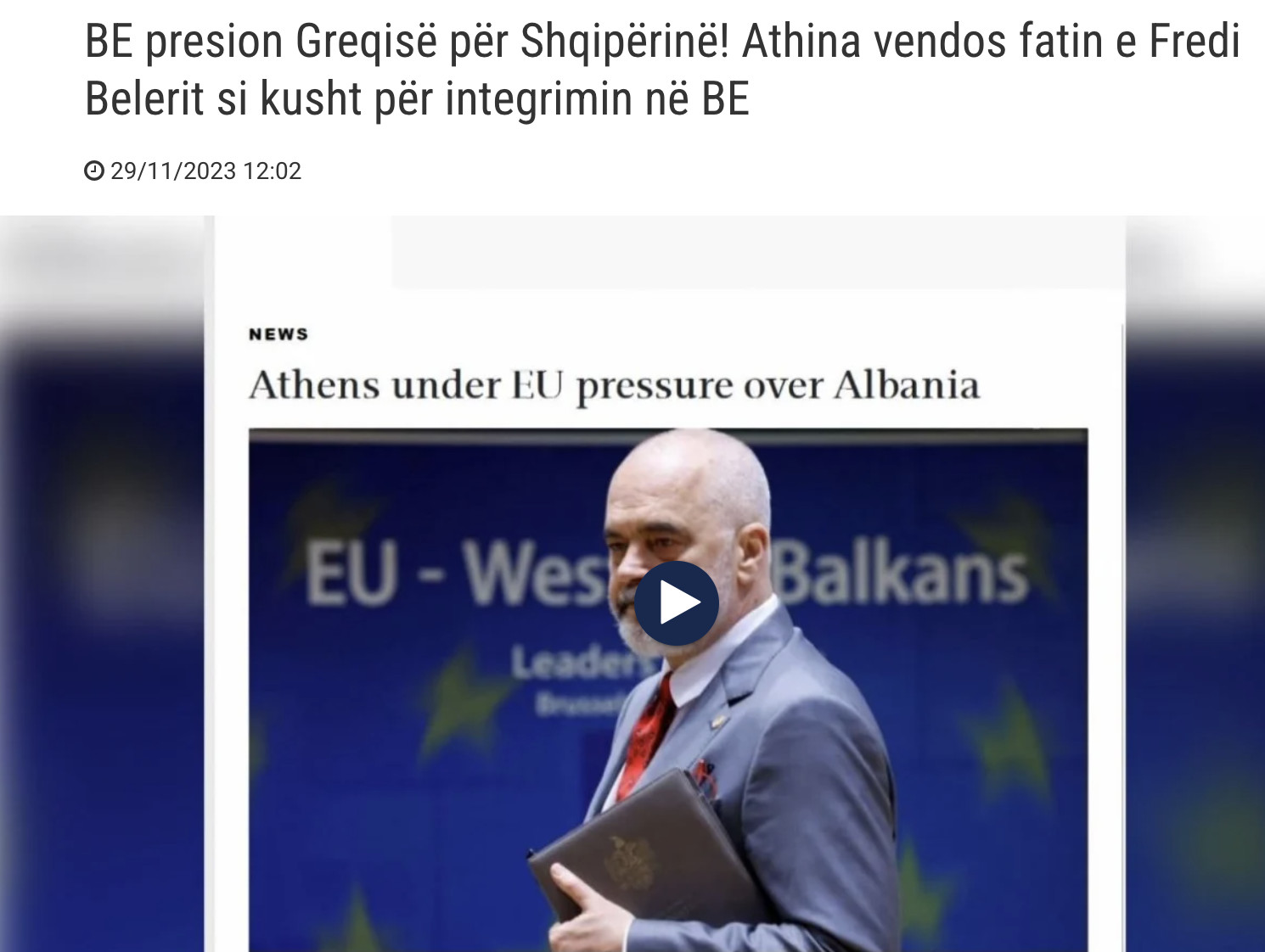 «Η Αθήνα αποφασίζει την τύχη του Φρέντι Μπέλερη ως προϋπόθεση για την ένταξη στην ΕΕ» γράφει σε τίτλο του το αλβανικό μέσο Top Channel.
