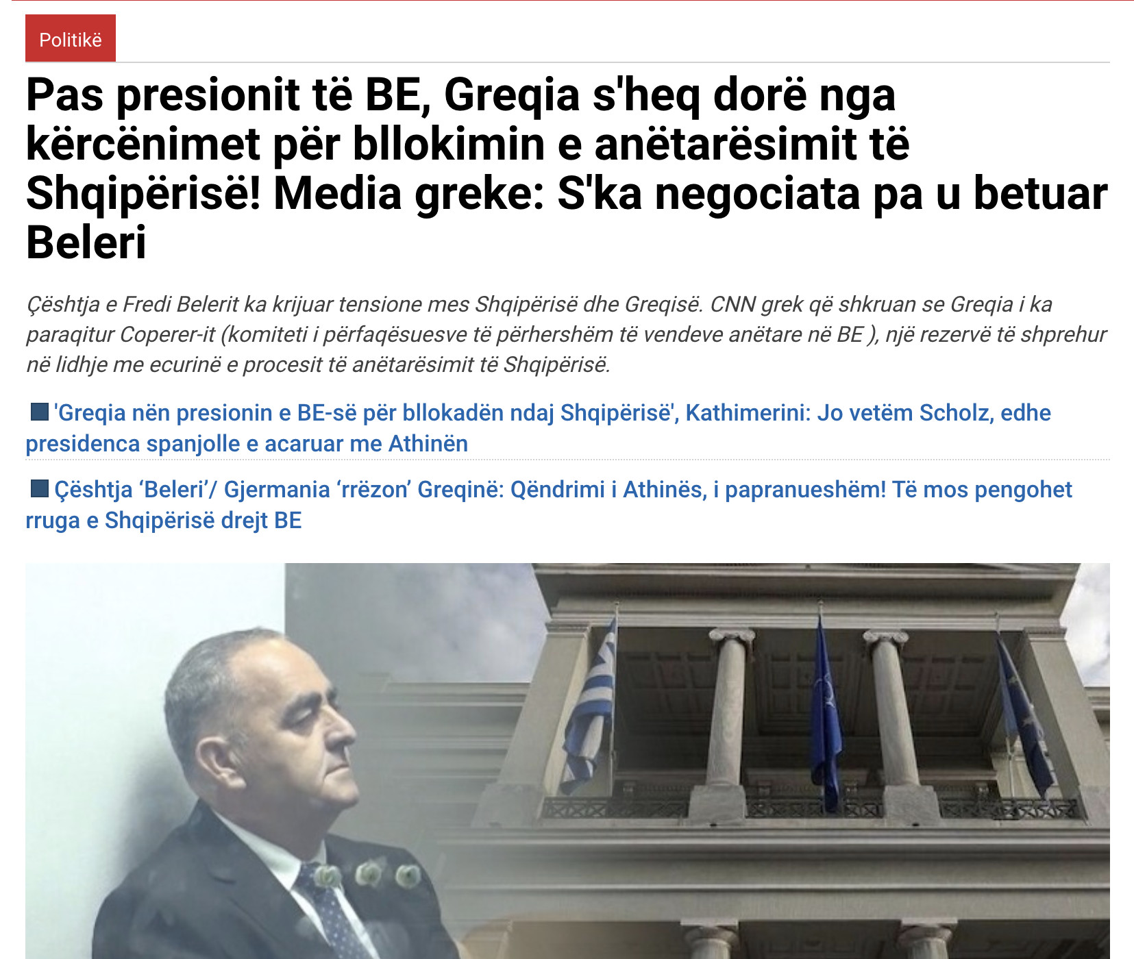 «Η Αθήνα έχει σκληρύνει τη στάση της για τις προϋποθέσεις ένταξης της Αλβανίας στην Ευρωπαϊκή Ένωση για την υπόθεση Μπελέρη» γράφει και συνεχίζει: