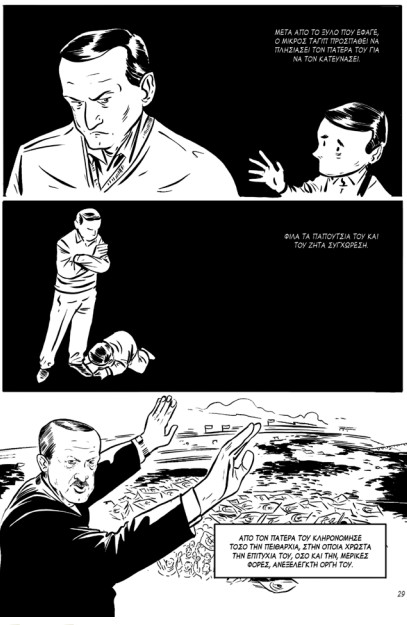Για να είμαι ειλικρινής, το πιο δύσκολο κομμάτι του βιβλίου ήταν να αποφύγω τη δαιμονοποίηση του προσώπου. Σκεφτείτε ότι γράφετε για έναν άνθρωπο που κατέστρεψε τη ζωή σας, αλλά και την πατρίδα σας. Ηταν σίγουρο ότι ξεκινούσα με θυμό. Από την άλλη, είμαι δημοσιογράφος, οπότε έπρεπε να σταθμίσω την τεκμηρίωση και να μείνω «ουδέτερος» στο μέτρο του δυνατού. Επρεπε το graphic novel να λειτουργεί και ως ερευνητικό πρότζεκτ. Γι’ αυτό έπιανα πολλές φορές τον εαυτό μου να μονολογεί «πρόσεχε να μην τον δαιμονοποιήσεις, προσπάθησε τις ισορροπίες». Θα έλεγα ότι πίεσα τον εαυτό μου να τον κατανοήσει πρώτα: τι έφτιαξε τον Ερντογάν έτσι όπως τον ξέρουμε; Ετσι θα ήταν ευκολότερο να κατανοήσουμε και τους πολιτικούς της γενιάς του.