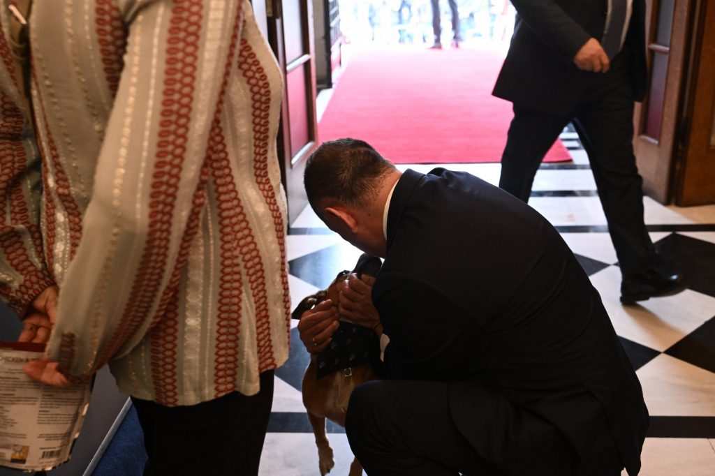 Για μία ακόμη φορά ο σκύλος τράβηξε πάνω του τα βλέμματα, ενώ εισερχόμενος ο επικεφαλής της ελληνικής διπλωματίας, Γιώργος Γεραπετρίτης, τον χάϊδεψε.