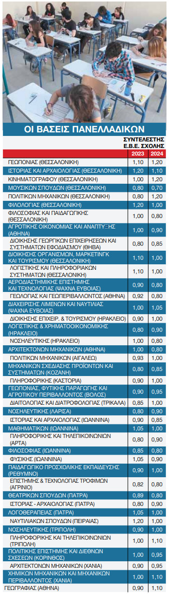 Οι μεγαλύτερες αυξήσεις παρατηρούνται στη σχολή Πολιτικών Μηχανικών Θεσσαλονίκης (με τον συντελεστή να αυξάνεται από το 0,80 στο 1,20), Κινηματογράφου Θεσσαλονίκης (από 1,00 σε 1,20), και Γεωγραφίας στην Αθήνα (με τον συντελεστή να αυξάνεται από το 0,90 στο 1,10). Οι μεγαλύτερες μειώσεις σημειώνονται στις σχολές Φιλολογίας Θεσσαλονίκης (από 1,20 σε 1,00), Φιλοσοφίας και Παιδαγωγικής της Θεσσαλονίκης (από 1,00 σε 0,80), Νοσηλευτικής Ηρακλείου (από 1,00 σε 0,80), Αρχιτεκτόνων Μηχανικών Αθήνας (από 1,00 σε 0,80), Ναυτιλιακών Σπουδών του Πειραιά (από 1,20 σε 1,00).