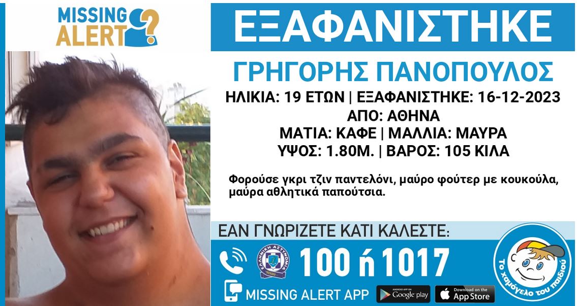 Σύμφωνα με το Missing Alert, ο 19χρονος Γρηγόρης εξαφανίστηκε το Σάββατο 16 Δεκεμβρίου 2023 και το Χαμόγελο του Παιδιού προχώρησε στη δημοσιοποίηση των στοιχείων του ενήλικου κατόπιν αιτήματος των οικείων του καθώς ενδέχεται να συντρέχουν λόγοι οι οποίοι θέτουν τη ζωή του σε κίνδυνο.