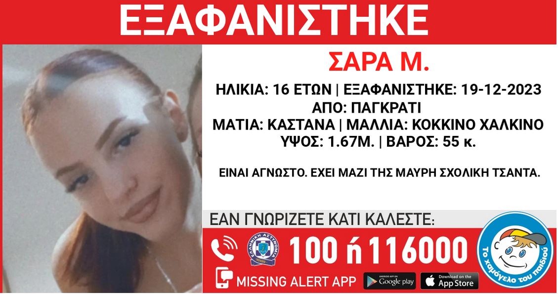 Στις 19 Δεκεμβρίου πρωινές ώρες εξαφανίστηκε από το Παγκράτι Αττικής, η Σάρα Μ. 16 ετών. «Το Χαμόγελο του Παιδιού» ενημερώθηκε για την εξαφάνιση της Σάρα και προχώρησε στην δημοσιοποίηση των στοιχειών της ανήλικης, κατόπιν αιτήματος της οικογένειάς της, καθώς ενδέχεται να συντρέχουν λόγοι που θέτουν την ζωή της σε κίνδυνο.