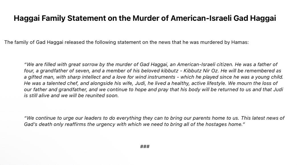 Μας γεμίζει μεγάλη θλίψη η δολοφονία του Γκαντ Χαγκάι, ενός Αμερικανοϊσραηλινού πολίτη. Ήταν πατέρας τεσσάρων παιδιών, παππούς επτά παιδιών και μέλος του αγαπημένου του κιμπούτς – του Κιμπούτς Νιρ Οζ.