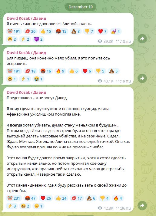Εκεί, μάλιστα, είχε αναφέρει και το όνομα “Αλίνα Αφανασκίνα”, από την οποία “εμπνεύστηκε” την επίθεση. “Επιτρέψτε μου να συστηθώ, το όνομά μου είναι David. Θέλω να προχωρήσω σε ένοπλη επίθεση σε σχολείο και ίσως σε αυτοκτονία, η Alina Afanaskina με έχει βοηθήσει πάρα πολύ», ανέφερε μεταξύ άλλων.