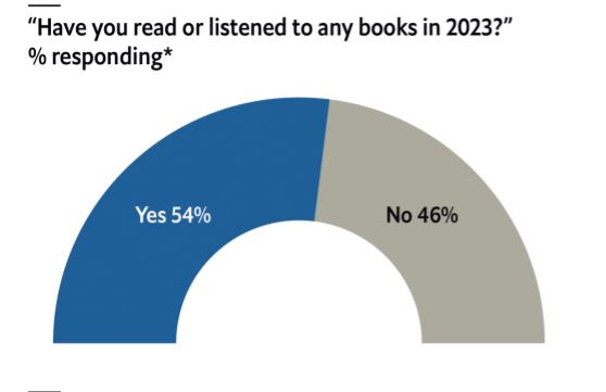 Μόλις λίγο περισσότεροι από τους μισούς, ποσοστό 54%, δήλωσαν ότι διάβασαν ή άκουσαν ένα βιβλίο στη διάρκεια του 2023. Από αυτούς που το έκαναν, ο μέσος όρος ήταν 11 βιβλία.