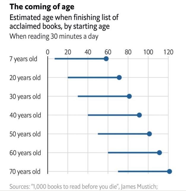 Για αναγνώστες που διαθέτουν μία ώρα την ημέρα για διάβασμα, ο Economist υπολόγισε ότι θα μπορούσαν να φτάσουν σε ένα έργο με την απαιτητικότητα του «Πόλεμος και Ειρήνη» είκοσι χρόνια νωρίτερα, στην ηλικία των 30 και στο μεγαλύτερο μέρος της ενηλικίωσής τους να διαβάσουν αριστουργήματα που δεν έχουν ακόμη δημοσιευτεί.