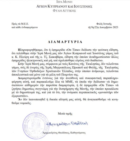 Η Ιερά Μονή του Αγίου Κυπριανού και Ιουστίνης στη Φυλή με ανακοίνωσή της το βράδυ της Παρασκευής 22/12 διέψευσε επίσης την ειδηση.