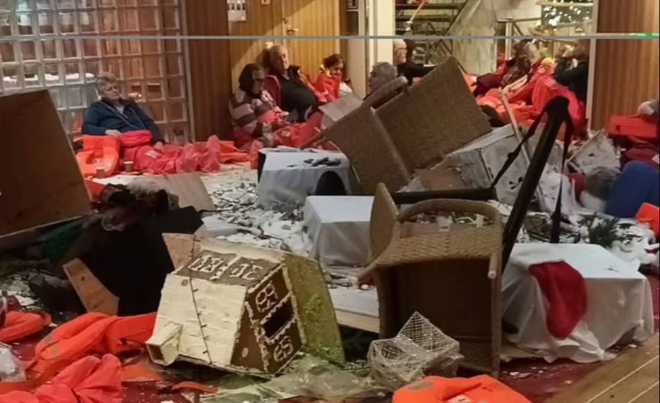 Ταλαιπωρημένοι επιβάτες φορώντας τα σωσίβιά τους ανάμεσα σε πεσμένες καρέκλες και τραπέζια (Πηγή: Daily Mail)