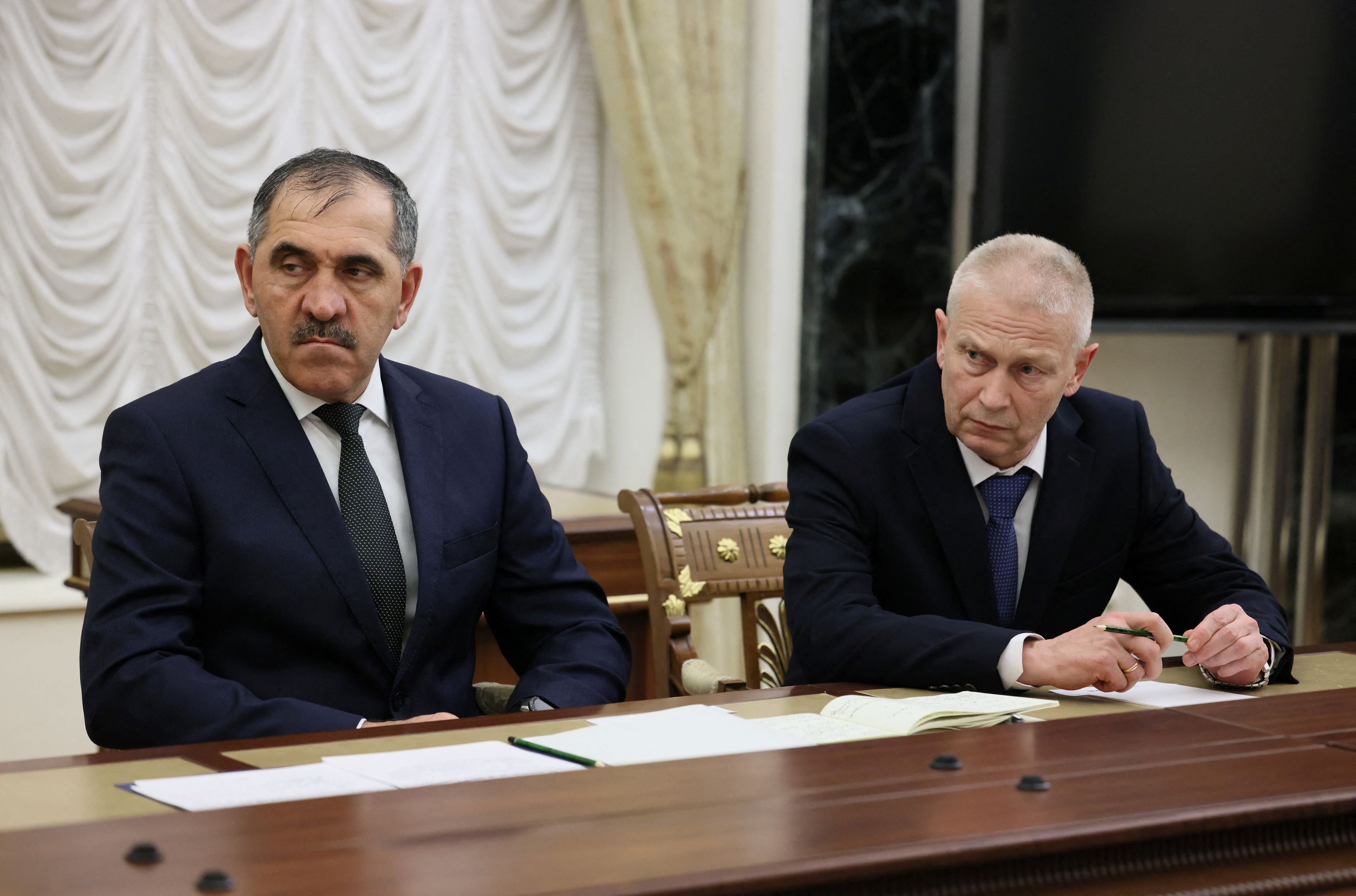 Ο Ρώσος αναπληρωτής υπουργός Άμυνας Yunus-Bek Yevkurov και ο ανώτερος πρώην διοικητής της μισθοφορικής ομάδας Wagner Andrei Troshev παρευρίσκονται σε συνάντηση με τον Ρώσο Πρόεδρο Βλαντιμίρ Πούτιν στη Μόσχα στις 28 Σεπτεμβρίου 2023.