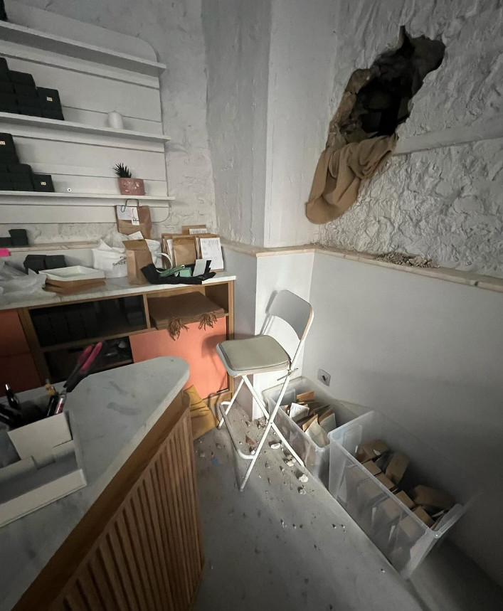 Όπως φαίνεται στις φωτογραφίες που δημοσίευσε η επιχείρηση στα social media, οι δράστες άνοιξαν μια τρύπα σε τοίχο, μπήκαν στο κατάστημα και μέσα σε έξι λεπτά άδειασαν όλα τα συρτάρια και τις προθήκες με τα κοσμήματα.