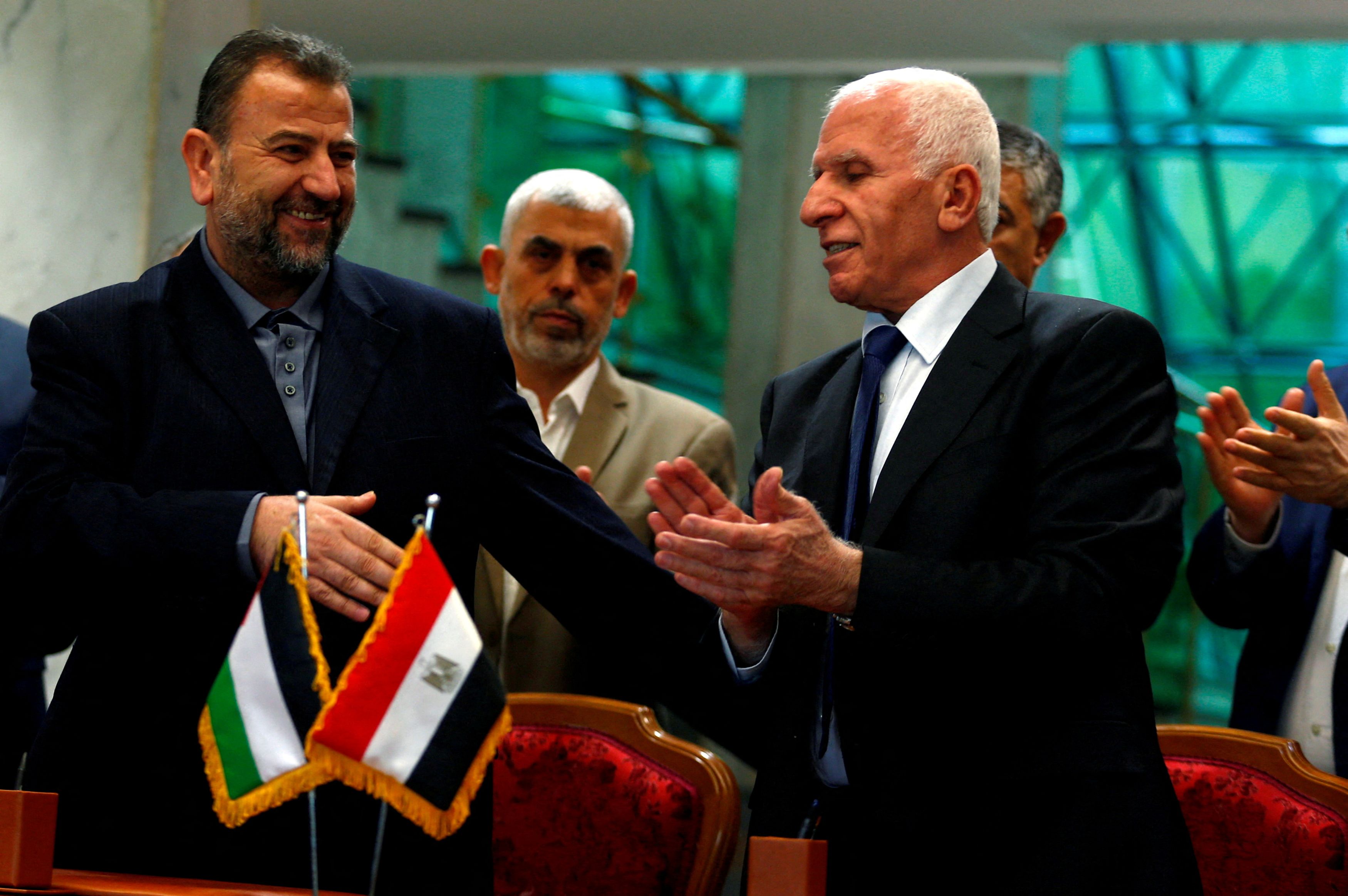 Ο επικεφαλής της αντιπροσωπείας της Χαμάς Σάλεχ Αλ-Αρούρι και ο ηγέτης της Φατάχ Azzam Ahmad υπογράφουν συμφωνία συμφιλίωσης στο Κάιρο, 12 Οκτωβρίου 2017. (REUTERS/Amr Abdallah)