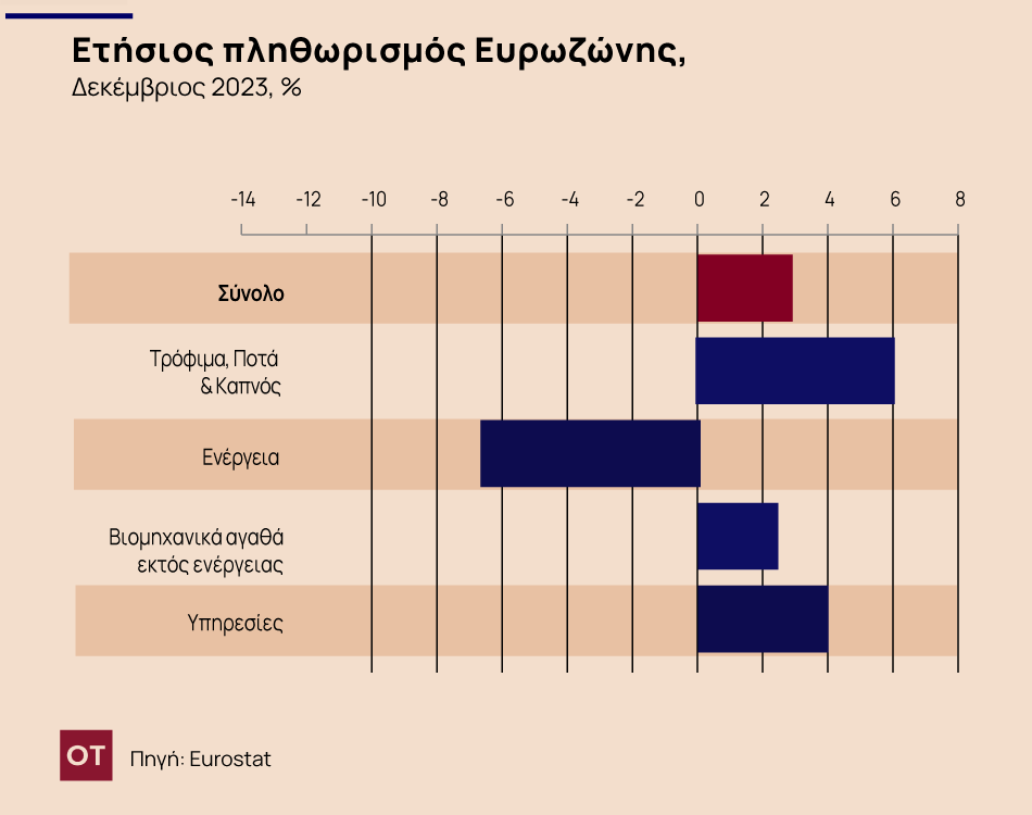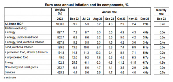 Εξετάζοντας τις κύριες συνιστώσες του πληθωρισμού της ζώνης του ευρώ, τα τρόφιμα, το αλκοόλ και ο καπνός εκτιμάται ότι σημείωσαν την υψηλότερη επίδοση τον Δεκέμβριο (6,1%, σε σύγκριση με 6,9% τον Νοέμβριο), ακολουθούμενα από τις υπηρεσίες (4,0%, σταθερός σε σύγκριση με με το Νοέμβριο), τα μη ενεργειακά βιομηχανικά αγαθά (2,5%, σε σύγκριση με 2,9% το Νοέμβριο) και την ενέργεια (-6,7%,