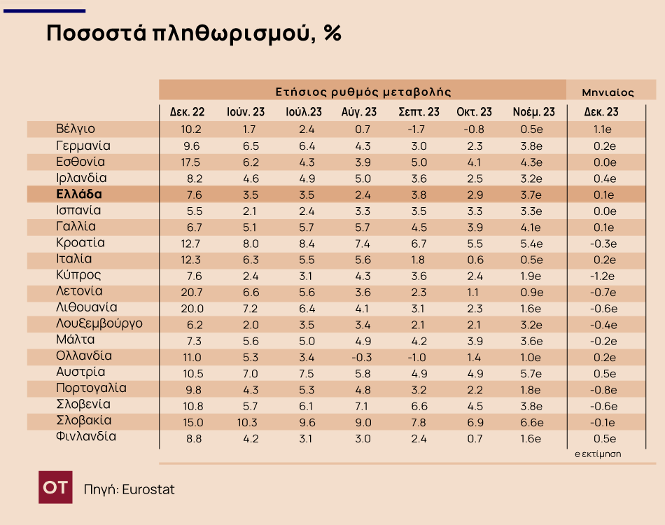 Νέα άνοδο στο 3,7% σημείωσε ο πληθωρισμός στην Ελλάδα κατά τον Δεκέμβριο του 2023, σύμφωνα με τη Eurostat, ενώ στην ευρωζώνη η «μπίλια» έκατσε στο 2,9%, κάτι που συνιστά νέα αύξηση.