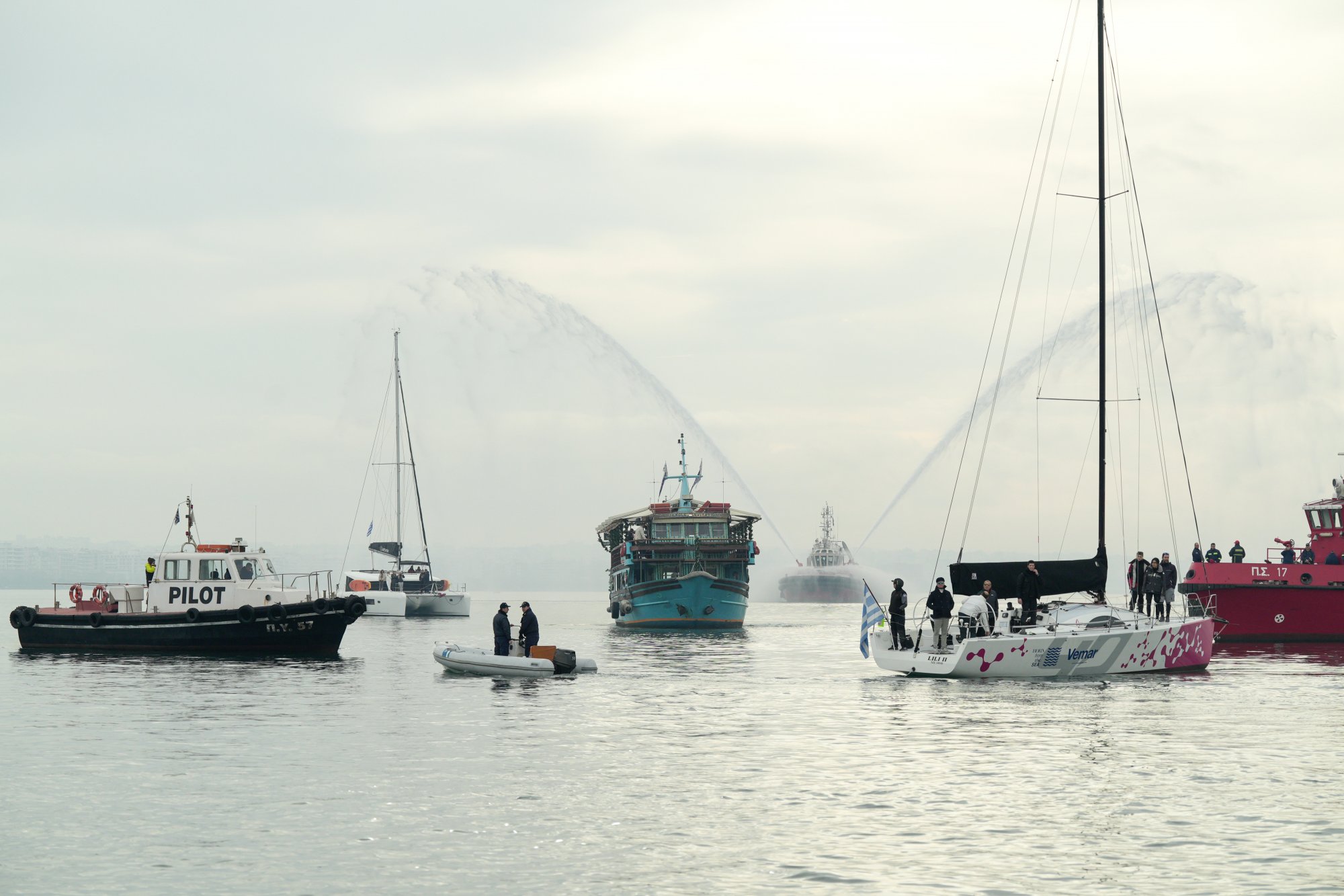 Σκάφη της Πυροσβεστικής υπηρεσίας δημιούργησαν υδάτινους πίδακες που εντυπωσίασαν τους παρευρισκόμενους.