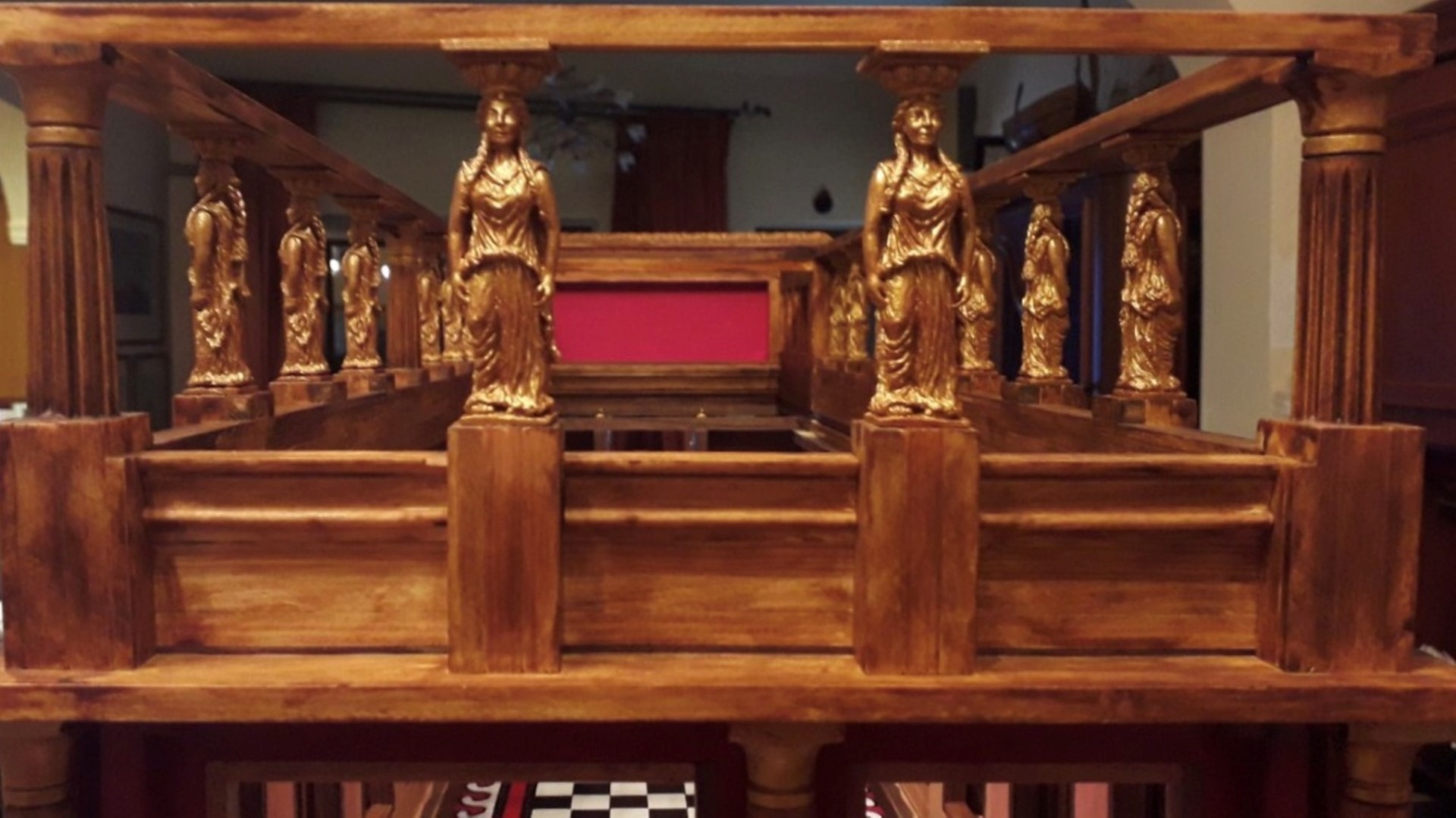 Και αυτό, το πανομοιότυπο μοντέλο της θαλαμηγού, που με χειρουργική ακρίβεια ο Γρυπιώτης και οι μαστόροι έχτισαν εκατοστό εκατοστό, με τα 60 δωμάτια, τους 500 αμφορείς, τα 60 αγάλματα, με τα ψηφιδωτά, τις τοιχογραφίες, τις αναπαραστάσεις, τα άλογα, τα ανάκλιντρα, τα λουστραρισμένα ξύλα, τα σκαλιστά κιονόκρανα, απομένει σιωπηλός μάρτυρας ενός ένδοξου ναυτικού παρελθόντος.