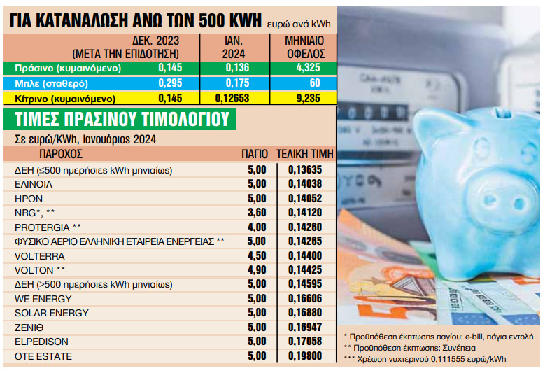 Κίτρινο (κυμαινόμενο). Η τιμή χρέωσης για κατανάλωση κάτω των 500 kWh διαμορφώνεται σε 0,12653 ευρώ/kWh. Στο αντίστοιχο κυμαινόμενο τιμολόγιο τον Δεκέμβριο του 2023 οι τιμές ήταν 0,17 ευρώ/kWh (μετά την επιδότηση. Είναι πιο οικονομικό, δηλαδή, το κίτρινο τιμολόγιο κατά 0,01847 ευρώ (μετά την επιδότηση). Συνεπώς, το μηνιαίο κέρδος για τον καταναλωτή διαμορφώνεται σε 9,235 ευρώ (μετά την επιδότηση) και το ετήσιο (αν διατηρηθούν αυτές οι διαφορές) σε 110,82 ευρώ (μετά την επιδότηση), αντιστοίχως, για κατανάλωση 500 kWh τον μήνα.