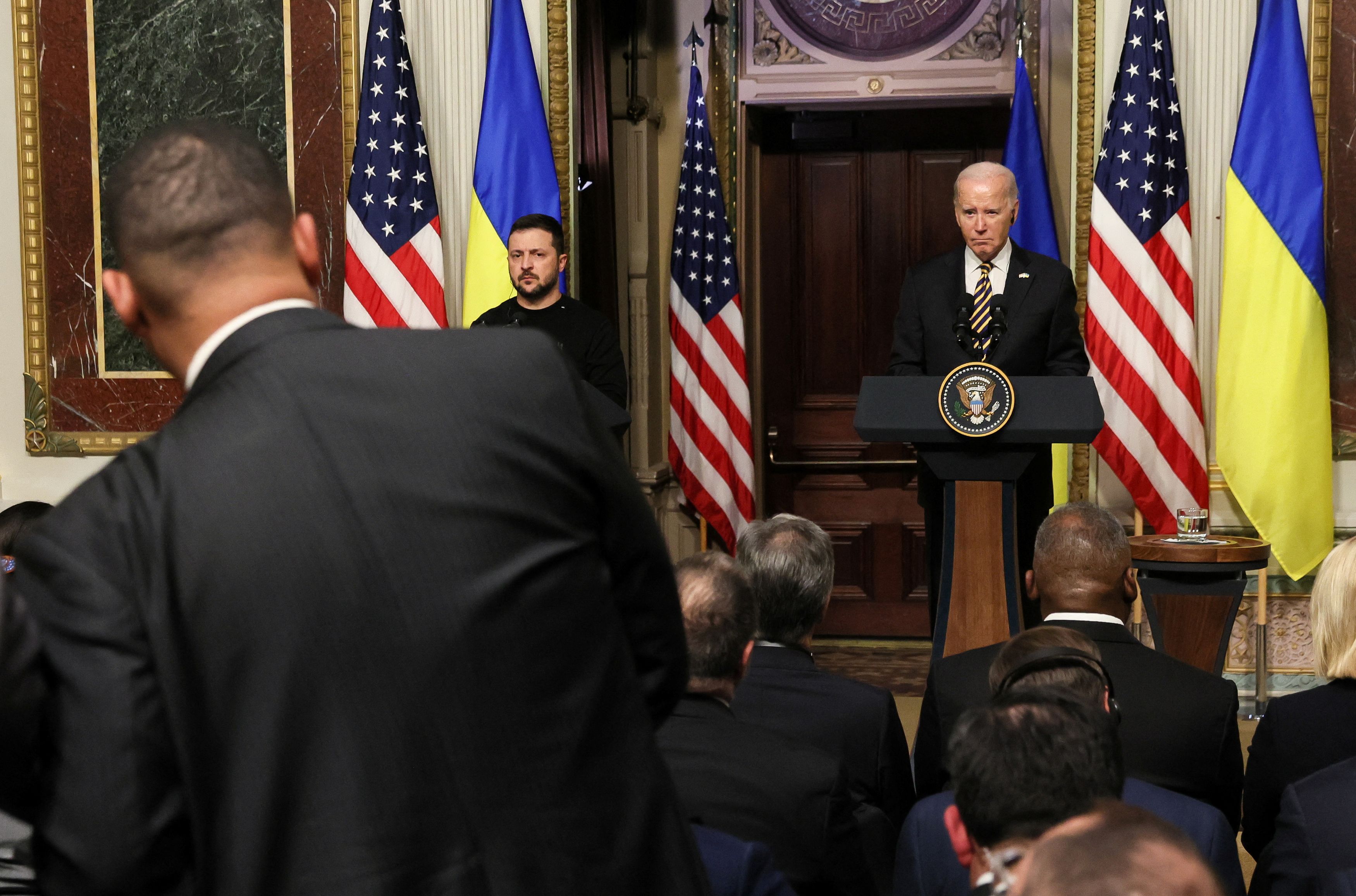 Ο Πρόεδρος των ΗΠΑ Τζο Μπάιντεν και ο Πρόεδρος της Ουκρανίας Βολοντίμιρ Ζελένσκι κατά τη διάρκεια κοινής συνέντευξης Τύπου στον Λευκό Οίκο στην Ουάσιγκτον, ΗΠΑ, 12 Δεκεμβρίου 2023, (REUTERS/Leah Millis).