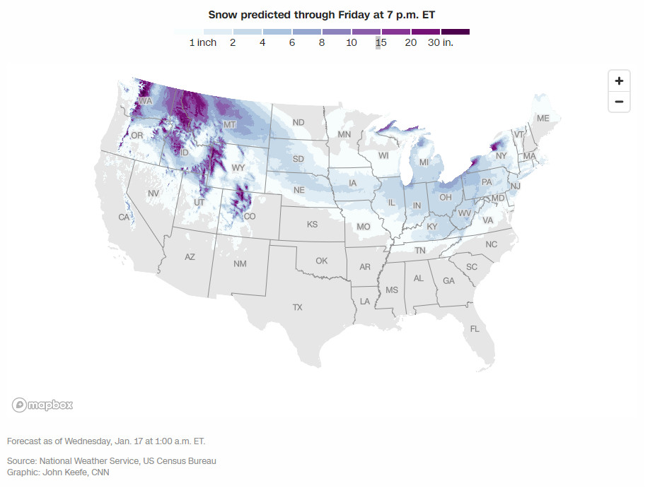 Στο γράφημα αυτό φαίνονται οι πολιτείες που θα επηρεάσει ο επερχόμενος χιονιάς
