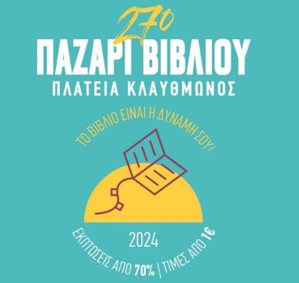 Από την Παρασκευή 26 Ιανουαρίου έως και την Κυριακή 18 Φεβρουαρίου 2024, πραγματοποιείται στην Πλατεία Κλαυθμώνος το μεγαλύτερο και πλέον οργανωμένο Παζάρι Βιβλίου στην πόλη των Αθηνών, σε μία σύγχρονη, υπαίθρια-στεγασμένη εγκατάσταση. Το αθηναϊκό, και όχι μόνο, αναγνωστικό κοινό έχει την ευκαιρία να προμηθευτεί βιβλία από μία μεγάλη ποικιλία τίτλων, όλων των κατηγοριών και για όλες τις ηλικίες.