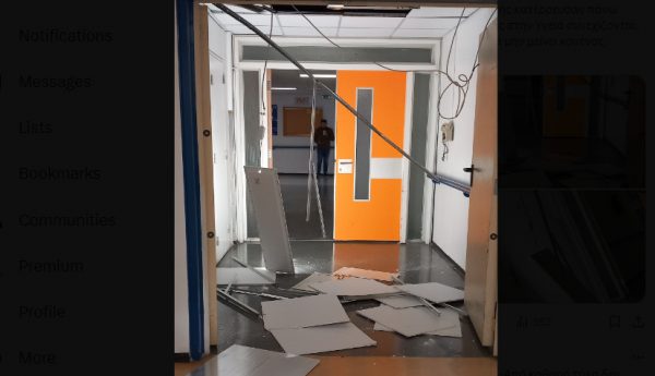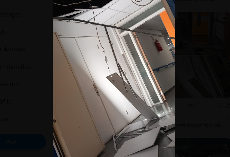Μαζί με τα κομμάτια της οροφής ξεκόλλησαν και αλουμινένια στηρίγματα προκαλώντας εκκωφαντικό θόρυβο και μεγάλη αναστάτωση στο νοσοκομείο.