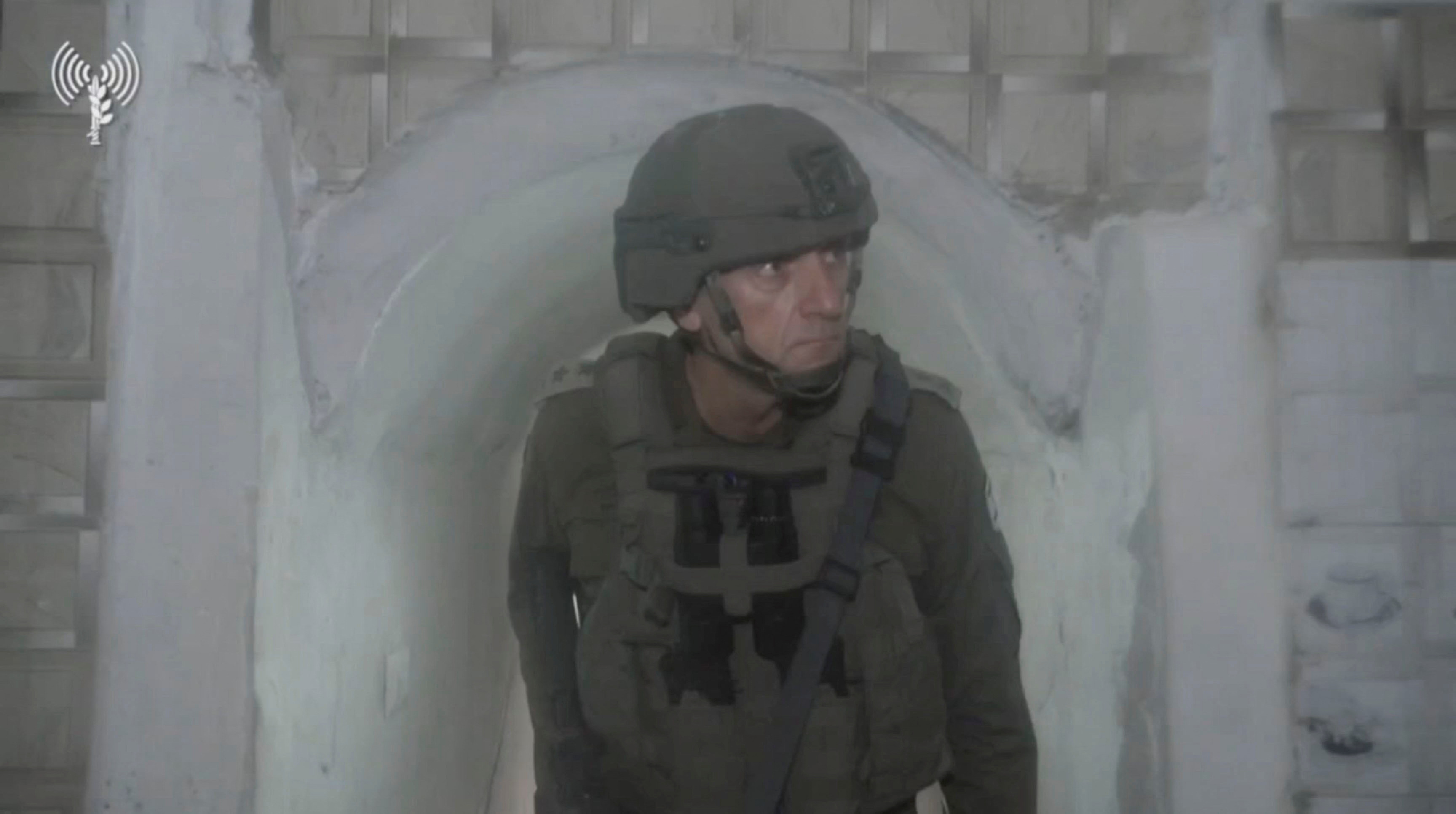 Ο αρχηγός του ισραηλινού επιτελείου στρατηγός Herzi Halevi εισέρχεται σε σήραγγα της Χαμάς στη Χαν Γιουνίς, όπως ισχυρίζονται οι Ισραηλινίες Ένοπλες Δυνάμεις, στις 6 Ιανουαρίου 2024. (REUTERS)