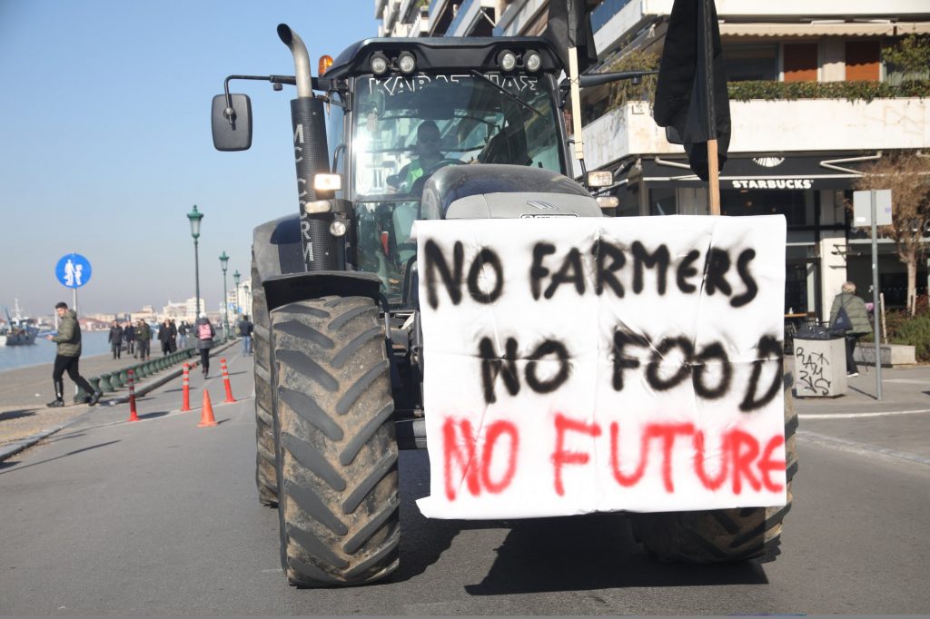 ίες ή μαύρου χρώματος και κορνάροντας συνεχώς, αγρότες από την Ημαθία, την Πέλλα, τις Σέρρες, το Κιλκίς, τη Θεσσαλονίκη και άλλες περιοχές, έχουν δημιουργήσει μια εντυπωσιακή εικόνα, διαμαρτυρόμενοι με αυτόν τον τρόπο για τα οξυμένα προβλήματα που αντιμετωπίζει ο κλάδος τους. Παράλληλα ένα τρακτέρ κουβαλά πάνω του μέχρι και… φέρετρο.