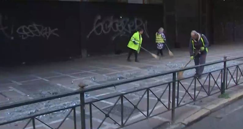 Τα συνεργεία του δήμου Αθηναίων προσπαθούν να καθαρίσουν το δρόμο