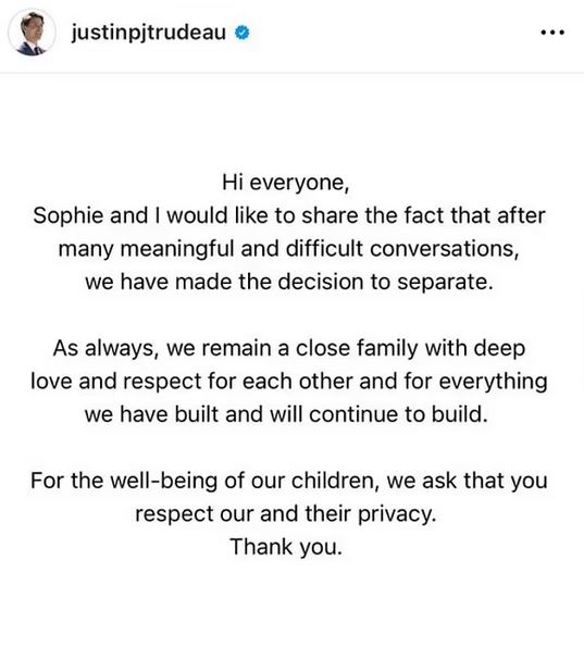 Οι Τριντό αποκάλυψαν στις 2 Αυγούστου 2023 ότι πήραν διαζύγιο μετά από 18 χρόνια γάμου και την απόκτηση τριών παιδιών. Οι λόγοι του χωρισμού τους δεν έγιναν γνωστοί, ωστόσο το ζευγάρι δήλωσε ότι η απόφαση ήρθε μετά από «πολλές δύσκολες συζητήσεις».