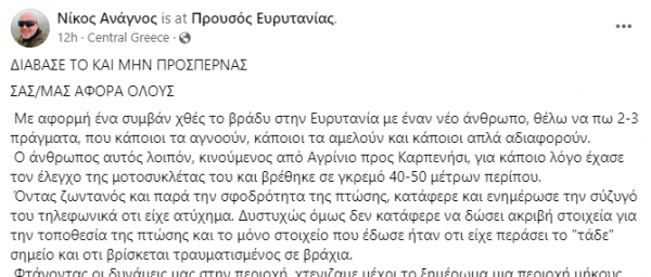 Με αφορμή την τραγική εξέλιξη που είχε το περιστατικό με την πτώση 46χρονου μοτοσικλετιστή σε γκρεμό στην Ευρυτανία, ο πυρονόμος της 7ης ΕΜΑΚ, Νίκος Ανάγνος, έκανε μια ανάρτηση στα μέσα κοινωνικής δικτύωσης σχετικά με τον σωτήριο ρόλο του τριψήφιου αριθμού 112.