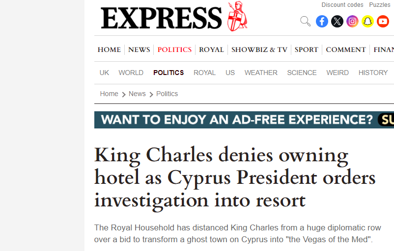 «Η βασιλική οικογένειά κρατάει σε απόσταση τον βασιλιά Κάρολο από μια τεράστια διπλωματική διαμάχη σχετικά με την προσφορά να μετατραπεί μια πόλη-φάντασμα στην Κύπρο ‘στο Λας Βέγκας της Μεσογείου’», προσθέτει στον υπότιτλο.