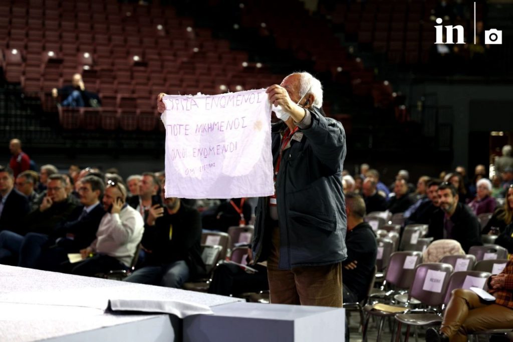 Πανό ενότητας μαζί με έναν ηλικιωμένο σύνεδρο σήκωσε ο πρόεδρος του ΣΥΡΙΖΑ – Προοδευτική Συμμαχία Στέφανος Κασσελάκης κατά τη διάρκεια της άφιξής του στο κλειστό του Tae Kwo Do, που διεξάγεται για δεύτερη μέρα το 4ο συνέδριο του κόμματος της αξιωματικής αντιπολίτευσης.