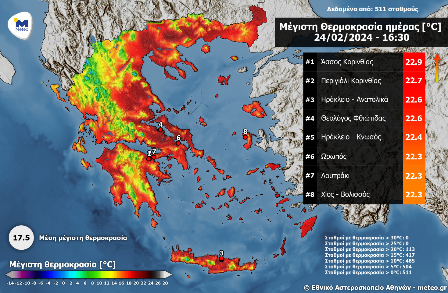 Χάρτης μεγίστων θερμοκρασιών, καθώς επίσης και οι οκτώ υψηλότερες μέγιστες θερμοκρασίες τις μεσημεριανές ώρες του Σαββάτου 24/02/2024, όπως αυτές καταγράφτηκαν από το δίκτυο αυτόματων μετεωρολογικών σταθμών του Εθνικού Αστεροσκοπείου Αθηνών / Meteo.gr.
