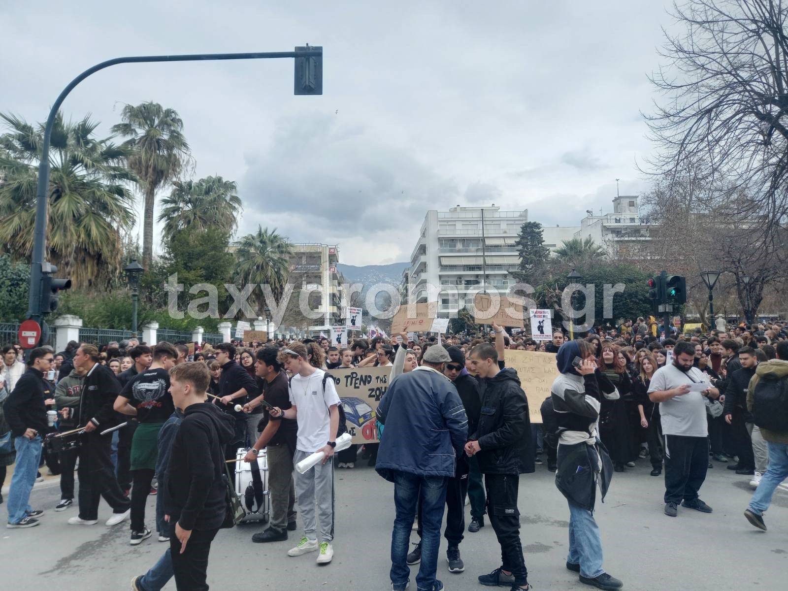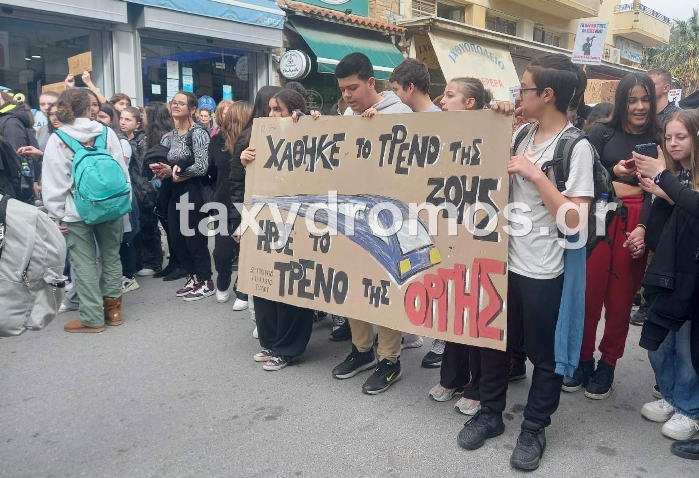Μαθητές κρατούν πλακάτ που γράφει «χάθηκε το τρένο της ζωής, ήρθε το τρένο της οργής»