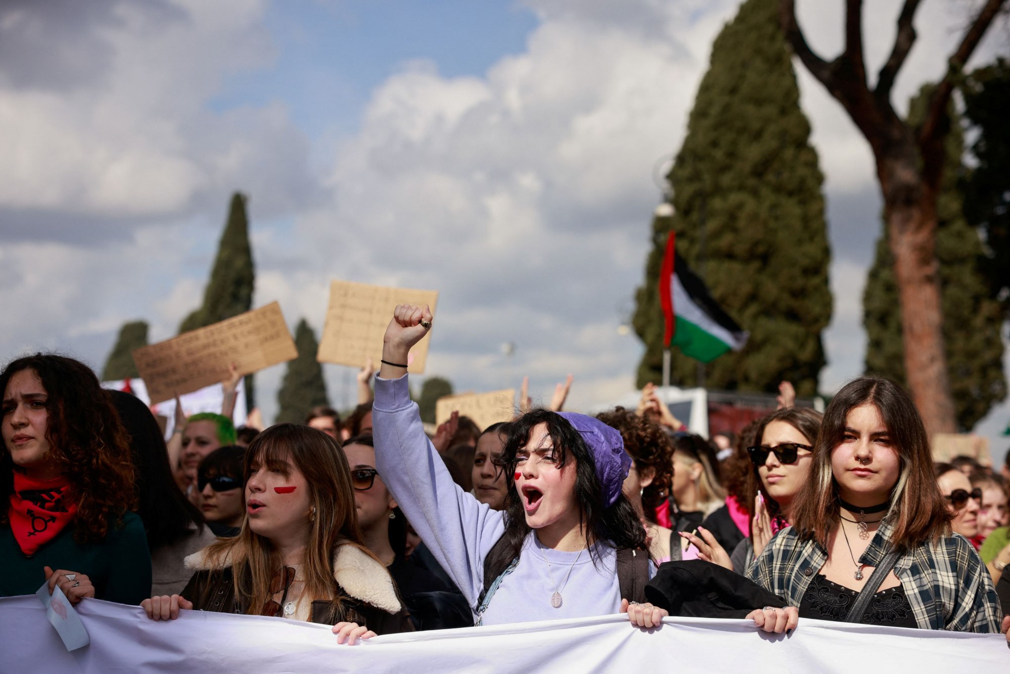 Στην κινητοποίηση συμμετέχουν επίσης πολλοί Ιταλοί μαθητές και φοιτητές των ιταλικών σχολείων, οι οποίοι κρατούν πανό με την επιγραφή «δεν ξεχνάμε τις γυναίκες της Γάζας και όλης της Παλαιστίνης».