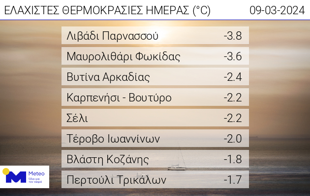 Στο Μαυρολιθάρι Φωκίδας το θερμόμετρο έδειξε -3.6°C, στη Βυτίνα Αρκαδίας -2.4°C, στο Καρπενήσι και το Σέλι -2.2°C και στο Τέροβο Ιωαννίνων -2.0°C