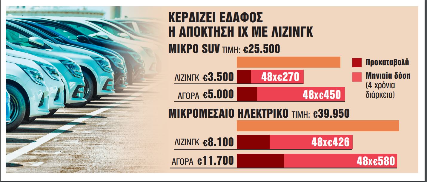 Για ένα SUV στην αγορά της χρονομίσθωσης η προκαταβολή μπορεί να αγγίξει τα 3.500 ευρώ με μίσθωμα 270 ευρώ για τέσσερα χρόνια. Αντιθέτως, μέσω της αγοράς ο υποψήφιος αγοραστής πρέπει να επενδύσει 25.500 ευρώ.