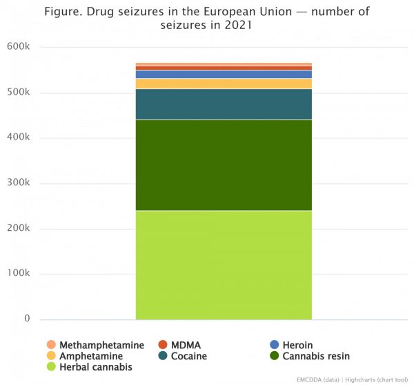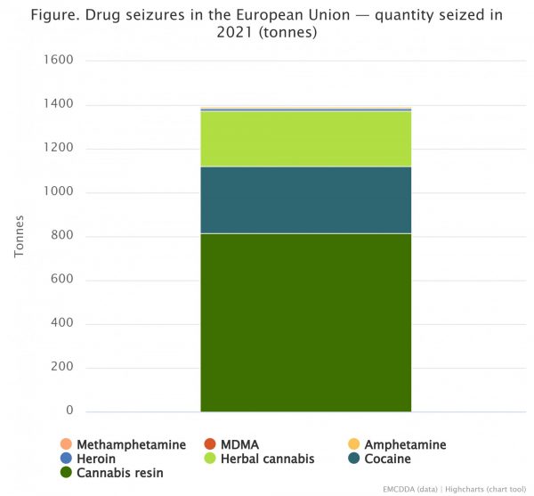 Το 2021, τα κράτη μέλη της ΕΕ κατάσχεσαν 303 τόνους κοκαΐνης, αριθμός ρεκόρ. Η διακίνηση μεγάλων ποσοτήτων κοκαΐνης μέσω των μεγάλων θαλάσσιων λιμένων της Ευρώπης, σε διατροπικά εμπορικά εμπορευματοκιβώτια, αποτελεί σημαντικό παράγοντα για την υψηλή διαθεσιμότητα του ναρκωτικού αυτού στην Ευρώπη σήμερα.