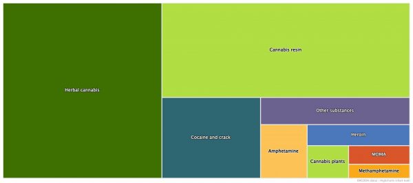 Οι αρμόδιες υπηρεσίες έχουν πλήρη χαρτογράφηση των ναρκωτικών. Οι συνολικές κατασχέσεις ανέρχονται σε 68.000 αριθμητικά. Μπορεί να αφορά από μικρές έως μεγάλες ποσότητες. Συνολικά έχουν κατασχεθεί 303 τόννοι. Η τιμή λιανικής σε σχέση για ένα γραμμάριο ανέρχεται από 22 έως 98 ευρώ, με τις περισσότερες περιπτώσεις να αφορούν από τα 55 έως τα 90 ευρώ.