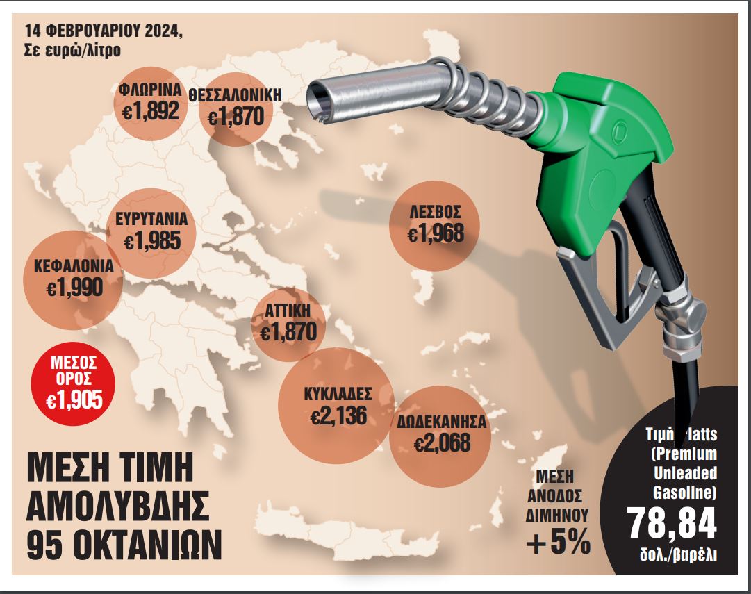 Πιο συγκεκριμένα, ο πανελλήνιος σταθμισμένος μέσος όρος των τιμών της απλής αμόλυβδης (95 οκτανίων) την περασμένη Πέμπτη ήταν στα 1,905 ευρώ το λίτρο, από 1,852 στα μέσα Φεβρουαρίου και 1,820 την 1η Ιανουαρίου.