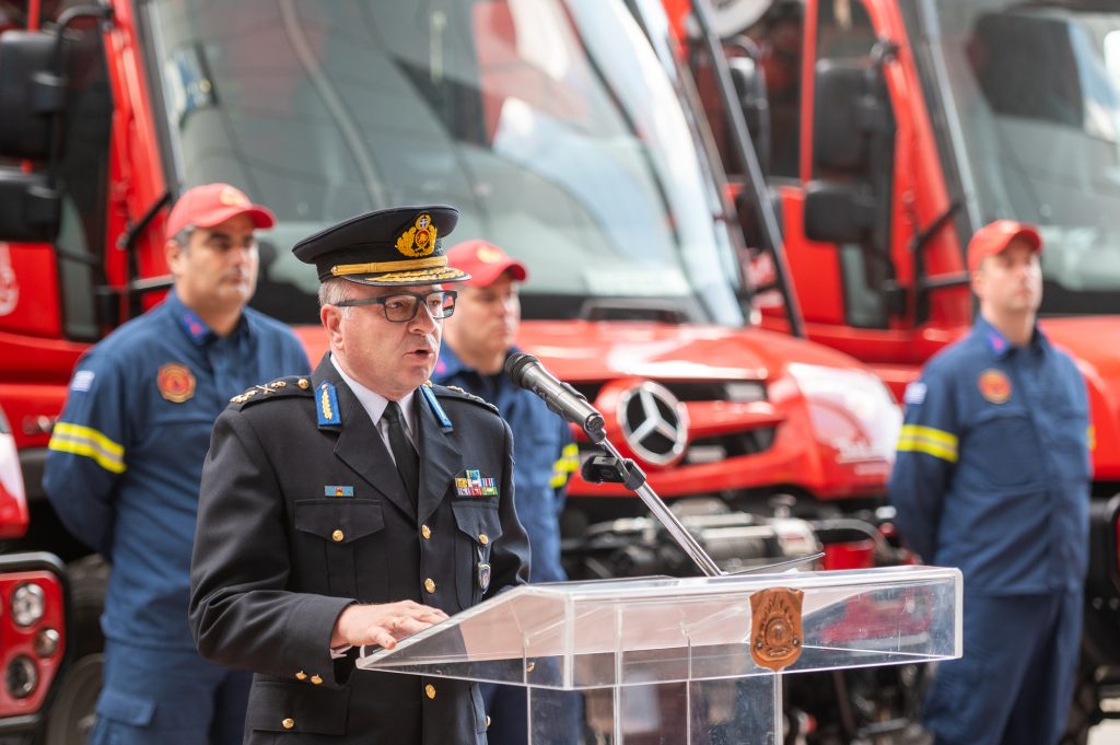 « Κύριε Υπουργέ, κυρία Πρόεδρε, κύριε Αρχηγέ, κύριε Υπαρχηγέ, κύριε Επιτελάρχη, κύριοι Στρατηγοί, κυρίες και κύριοι, με ιδιαίτερη χαρά στέκομαι σήμερα δίπλα σας αναγνωρίζοντας στο πρόσωπο της Πρόεδρου της Ένωσης Ελλήνων Εφοπλιστών, της Συν-Ένωσης, της κυρίας Μελίνας Τραυλού, την προσφορά – την ανιδιοτελή προσφορά – των ανθρώπων που πέτυχαν στη ζωή τους κι έχουν τη δυνατότητα να στηρίξουν και να βοηθήσουν τη χώρα μας. Η πατριωτική σας αυτή προσφορά αφορά το κοινό καλό. Και ταυτόχρονα έχει και ευγενή σκοπό, προκειμένου να μπορέσει η Πολιτική Προστασία, οι άντρες κι οι γυναίκες του Πυροσβεστικού Σώματος αλλά κι οι εθελοντές μας, όλοι όσοι επιχειρούν στην πρώτη γραμμή να αντιμετωπίσουν με τον καλύτερο δυνατό τρόπο, κάθε ανάγκη που θα προκύψει, για να προασπίσουν πάνω απ όλα την αξία της ανθρώπινης ζωής, τις περιουσίες όλων μας και φυσικά την οικολογία, το δάσος, τα φυσικά κάλλη της πατρίδας μας.