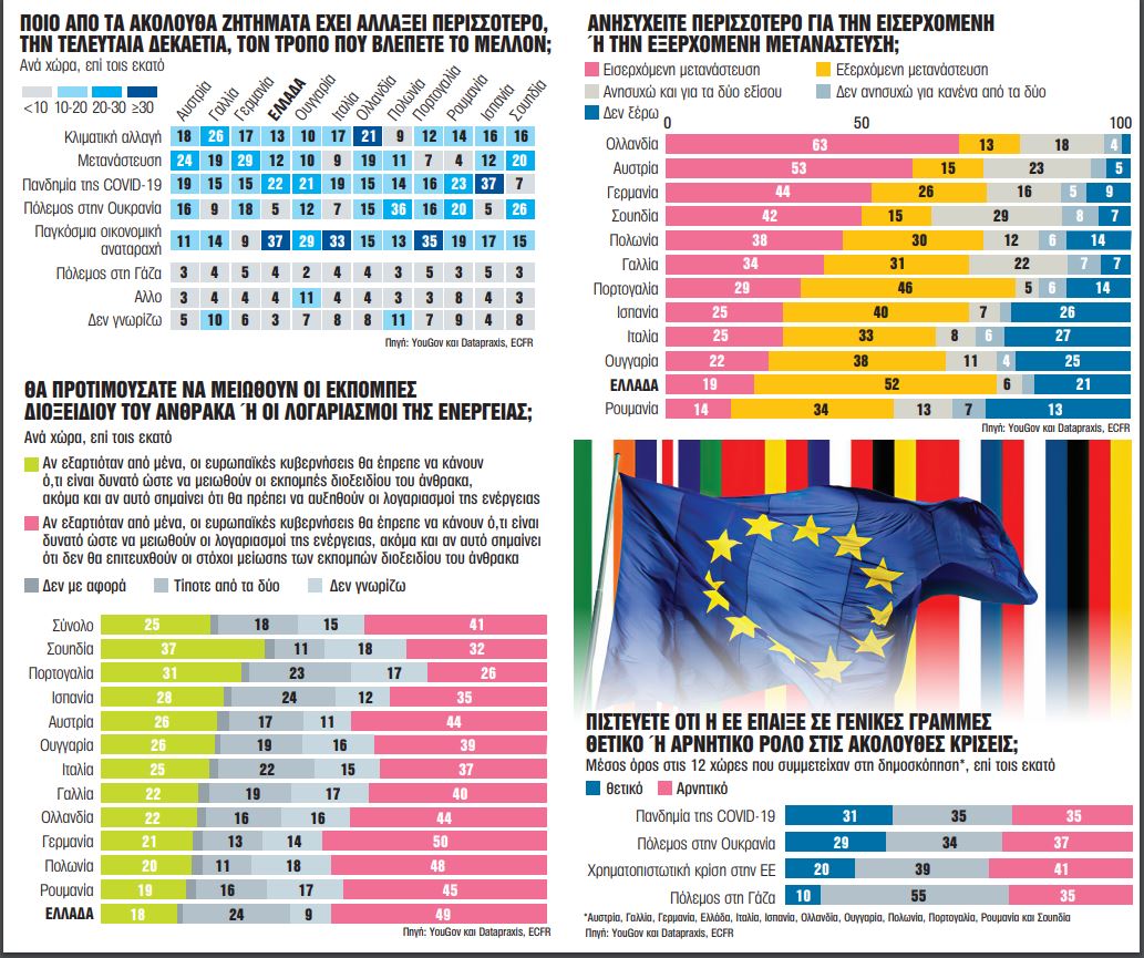 Η έρευνα όμως δείχνει ότι οι ευρωπαίοι ηγέτες θα έκαναν ακόμα ένα λάθος να προτάξουν ως προεκλογικό όπλο τα πεπραγμένα της ΕΕ αναφορικά με την πανδημία του COVID-19, την Πράσινη Νέα Συμφωνία και τη στήριξη προς την Ουκρανία. Γιατί οι επιτυχημένες επιδόσεις της σε αυτές τις κρίσεις δεν αναγνωρίζονται από πολλούς ψηφοφόρους. Επιπλέον, οι πολιτικές της ΕΕ για το κλίμα είναι διχαστικές. Είναι χαρακτηριστικό πως στην Ελλάδα ένα 49% των πολιτών δηλώνουν πως θα προτιμούσαν να μειωθούν οι λογαριασμοί της ενέργειας παρά οι εκπομπές CO2.