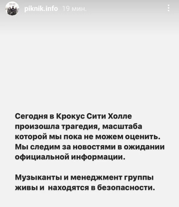 «Σήμερα συνέβη μια τραγωδία στο Crocus City Hall το μέγεθος της οποίας δεν μπορούμε ακόμη να εκτιμήσουμε. Παρακολουθούμε τις ειδήσεις εν αναμονή επίσημης ενημέρωσης. Οι μουσικοί και η διεύθυνση του συγκροτήματος είναι ζωντανοί και ασφαλείς».