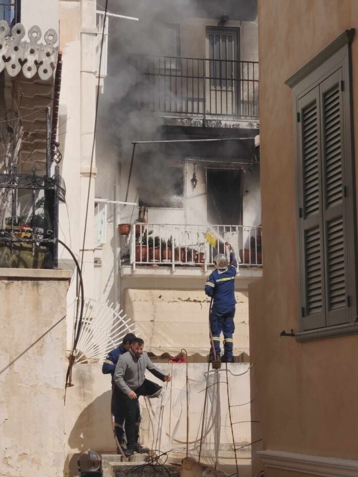 Η φωτιά εκδηλώθηκε, σε διαμέρισμα τριώροφου κτιρίου (φωτογραφία πάνω από cyclades24.gr), μέσα στο οποίο οποίο βρισκόταν μια 88χρονη γυναίκα.
