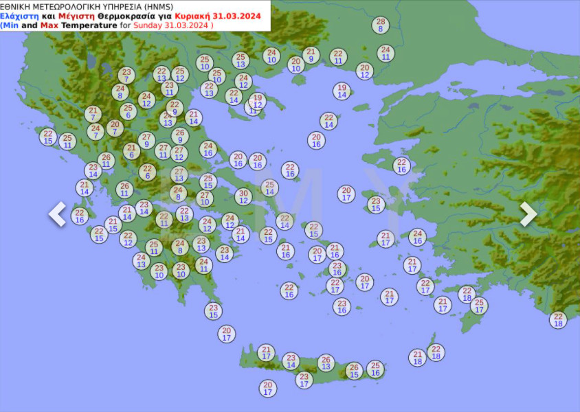 Θερμοκρασία: Από 13 έως 25 και στην Κρήτη έως 27 βαθμούς Κελσίου.