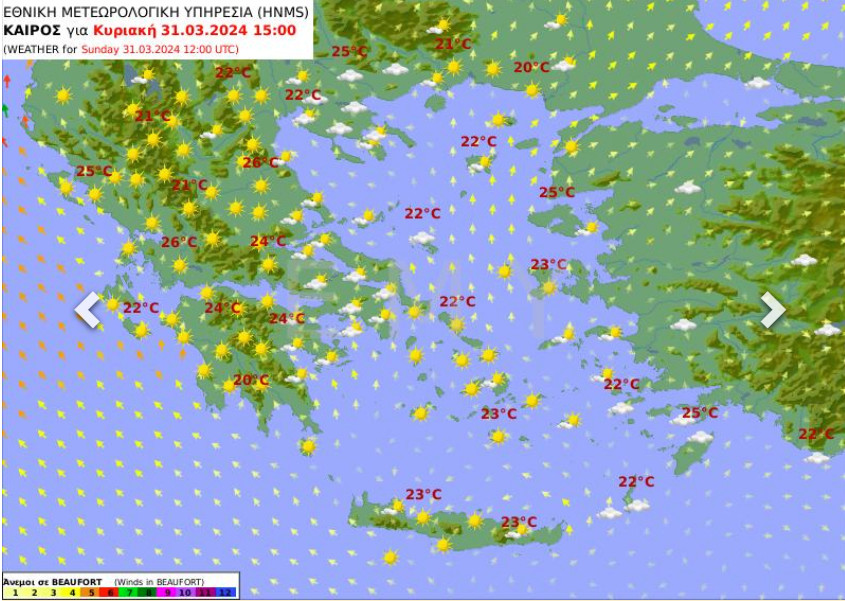 Θερμοκρασία: Από 15 έως 25 και στα Δωδεκάνησα έως 27 βαθμούς Κελσίου. Στα βόρεια η ελάχιστη 2 με 3 βαθμούς χαμηλότερη.