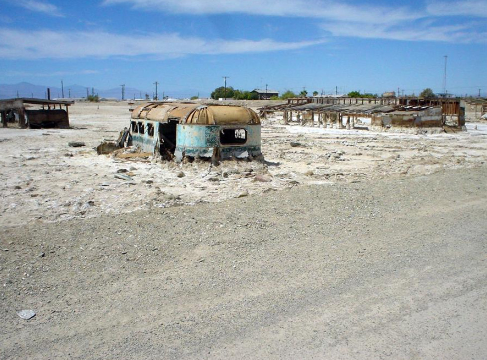 Εγκαταλελειμμένες κατασκευές επικαλυμμένες με αλάτι στην ακτή της Θάλασσας του Σάλτον στην παραλία της Βομβάης το 2004 (Wikipedia).