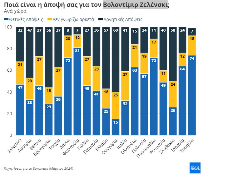 Στο σύνολο, στη Σκανδιναβία και την Ιβηρική Χερσόνησο, ο Ζελένσκι λαμβάνει τις περισσότερες θετικές αξιολογήσεις: 81% στη Φινλανδία, 74% στη Σουηδία, 72% στη Δανία και την Πορτογαλία και 64% στην Ισπανία. Αντίθετα, περισσότεροι από τους μισούς ερωτηθέντες στην Ουγγαρία (60%), την Ελλάδα (57%) και τη Βουλγαρία (56%) έχουν αρνητική γνώμη για τον Ουκρανό πρόεδρο.