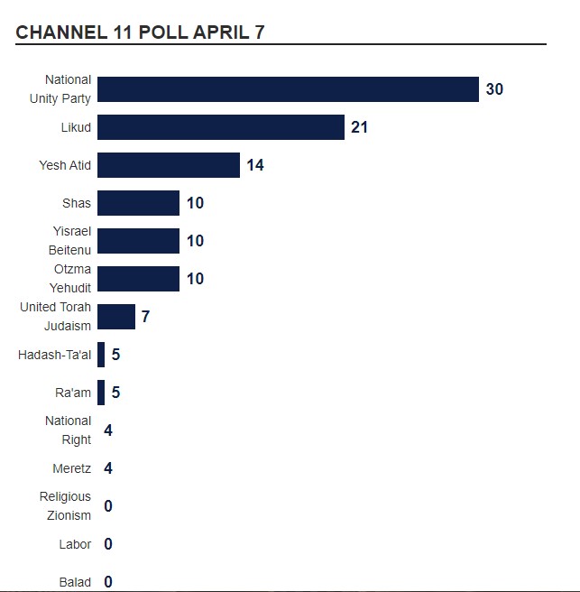 Φαίνεται πως ο Γκάντζ γνωρίζει τι κάνει, καθώς σύμφωνα με δύο νέεες δημοσκοπήσεις που μετέδωσαν τα ισραηλινά κανάλια Kan 11 και 12 News την Κυριακή 7 Απριλίου, η συμμαχία του Μπενιαμίν Νετανιάχου θα έχανε την πλειοψηφία αποσπώντας το πολύ 48 έδρες στη Κνεσέτ. Το δε κόμμα του Μπενιαμίν Νετανιάχου, το Λικούντ θα ερχόταν δεύτερο και καταϊδρωμένο.