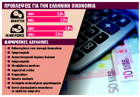 Η ελληνική οικονομία υστερεί στην απονομή δικαιοσύνης, στην καταπολέμηση της γραφειοκρατίας και στην αντιμετώπιση της φοροδιαφυγής, σημείωσε ο κεντρικός τραπεζίτης αναφέροντας ότι η επίτευξη ικανοποιητικού ρυθμού ανάπτυξης αποτελεί τη σημαντικότερη πρόκληση για την ελληνική οικονομία. Οι κίνδυνοι που περιβάλλουν την πρόβλεψη για την αύξηση του ΑΕΠ είναι κυρίως καθοδικοί και αφορούν: